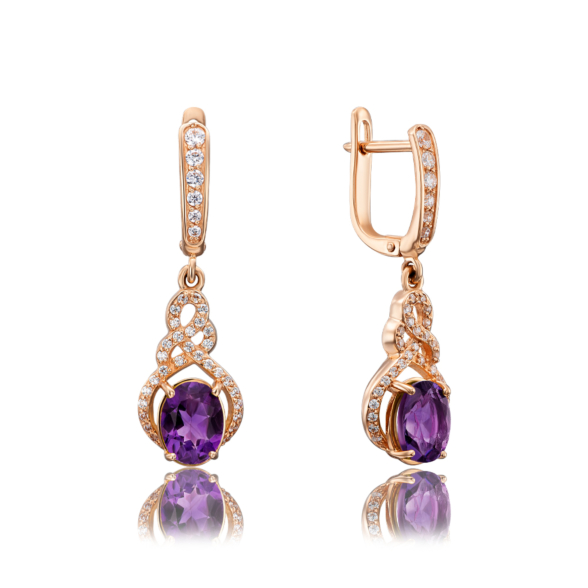 Подвеска из красного золота 585 пробы с аметистом и фианитами в сочетании с кольцом и серьгами станет прекрасным дополнением к вечернему или коктейльному образу.