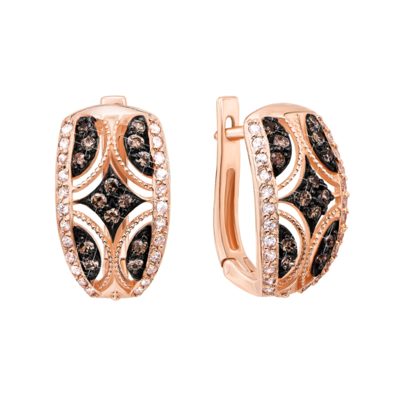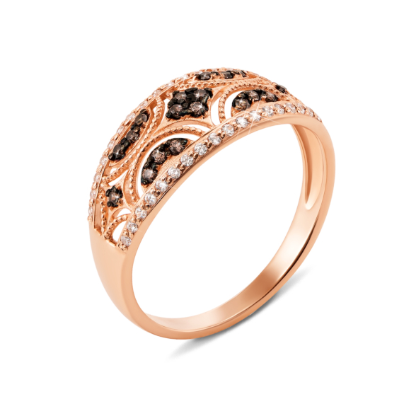 Кольцо из красного золота 585 пробы с прозрачными и темными фианитами – это эксклюзивное ювелирное изделие, в котором сочетается красота и изысканность, нежность и роскошь. Золотые изогнутые полукругом линии, которые окружают темные фианиты, соединяясь друг с другом образуют гармоничную композицию.