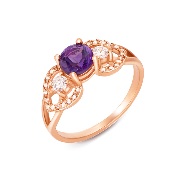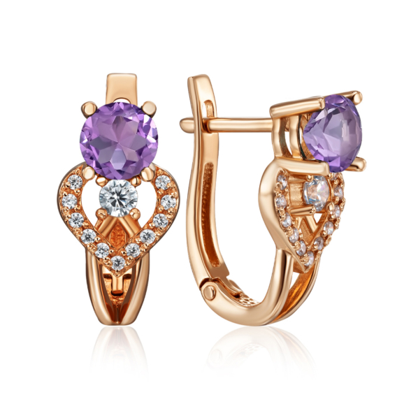 Серьги из красного золота с аметистом и фианитами в комплекте с кольцом станут подарком, символизирующим любовь и преданность.