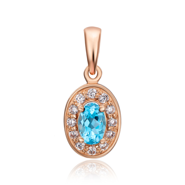 Золота підвіска овальної форми зі вставкою масивного блакитного топазу і розсипом невеликих фіанітів - коштовність, непідвладна часу. Класична обтікаєма форма і поєднання червоного золота зі світлими напівпрозорими каменями роблять ювелірну прикрасу актуальною в будь-якій ситуації.