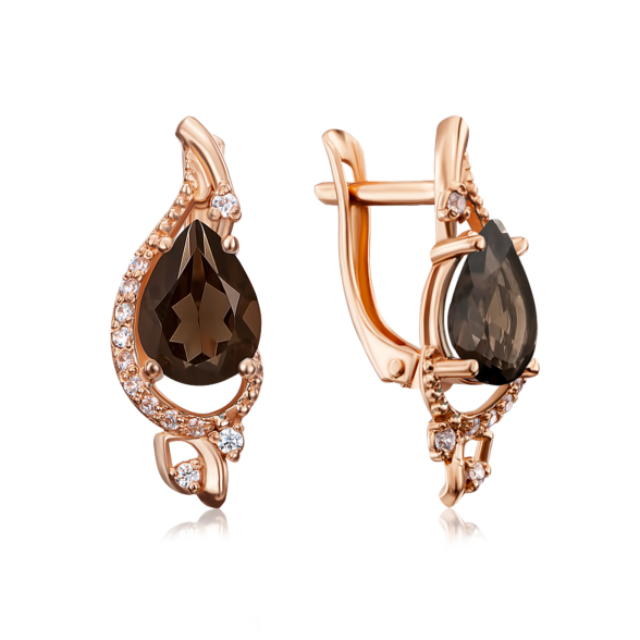 Сережки з червоного золота 585 проби з раухтопазом і фіанітами